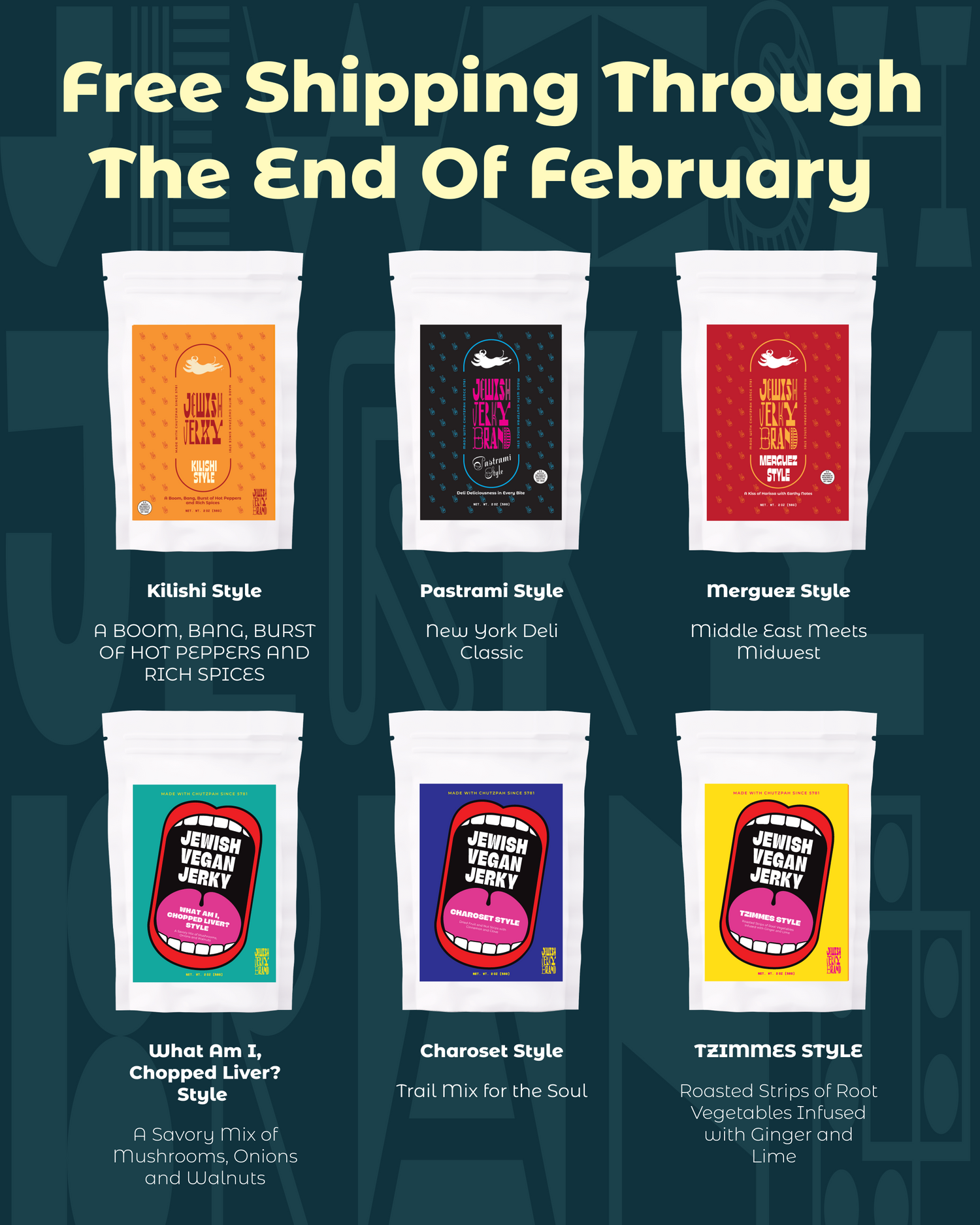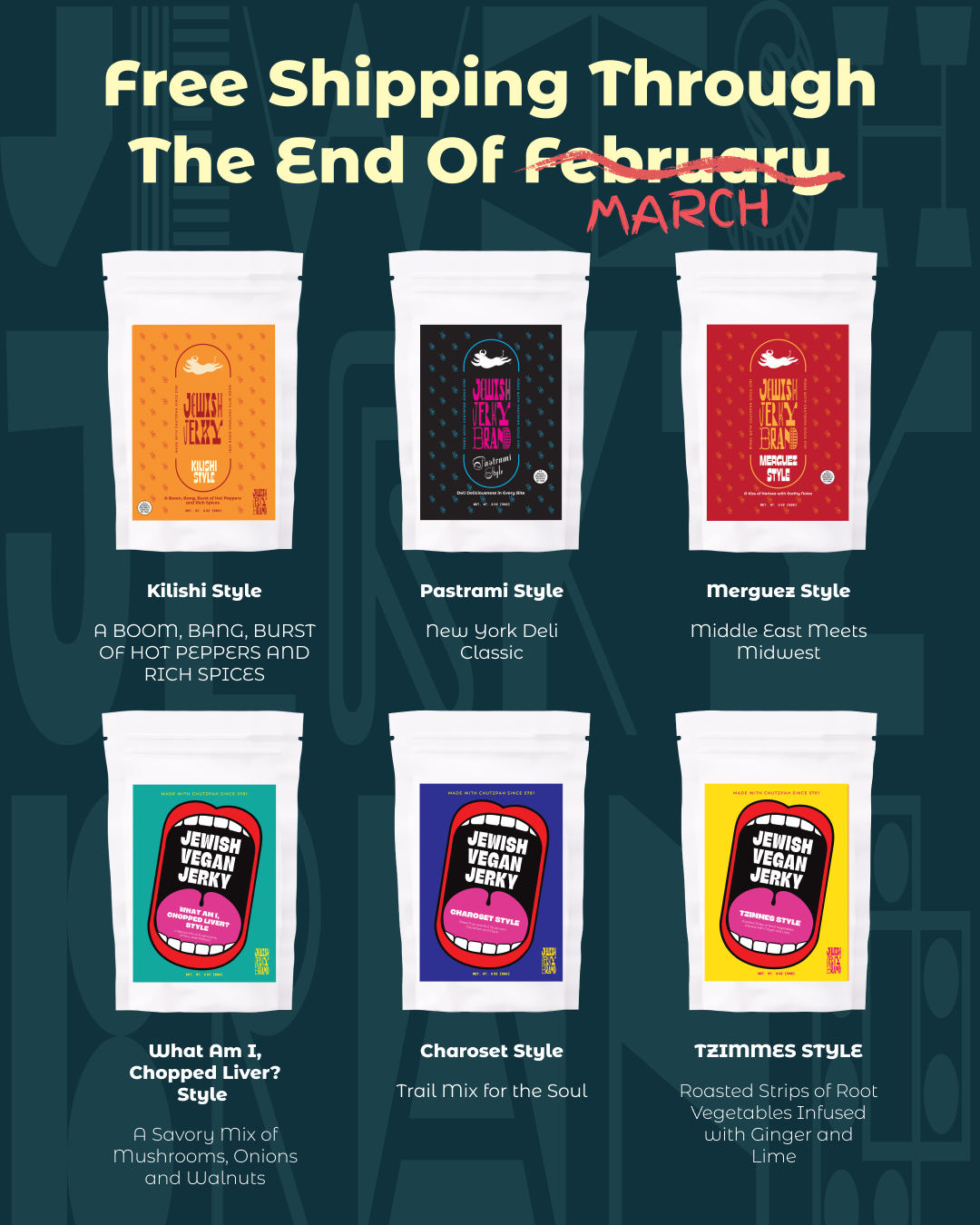 Now through the end of February, order some of our deliciously different jerky—inspired by Jewish foods and flavors from around the globe and we’ll cover the shipping fee. Just add promo code ShipFree at check out.